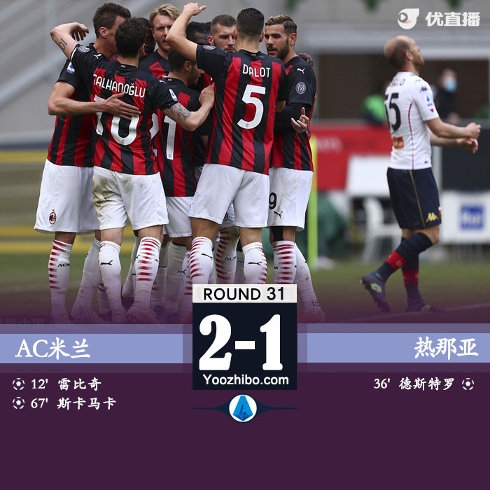 优直播4月18日讯 北京时间4月18日晚18点30分,2020-21赛季意甲第31轮在圣西罗球场展开角逐,AC米兰坐镇主场迎战热那亚。上半场雷比奇凌空斩,德斯特罗头球扳平,下半场雷比奇失良机,斯卡马卡自摆乌龙,克亚尔和托莫里门线救险。最终AC米兰主场2-1战胜热那亚,米兰取得联赛两连胜。积分榜方面,米兰积66分落后国米8分,位居第2名。