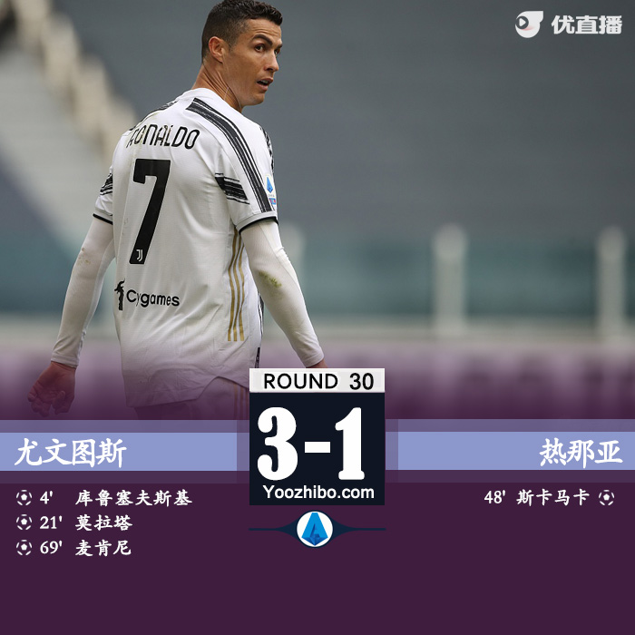 优直播4月11日讯 北京时间4月11日晚21点,意甲第30轮比赛继续进行,尤文图斯坐镇主场迎战热那亚。上半场,库卢塞夫斯基首开记录,C罗补射中柱,莫拉塔破门;下半场,斯卡玛卡头槌扳回一城,麦肯尼打进单刀球。最终,尤文主场3-1战胜热那亚,积分达到62分,落后身前的AC米兰1分,仍然位列第三。