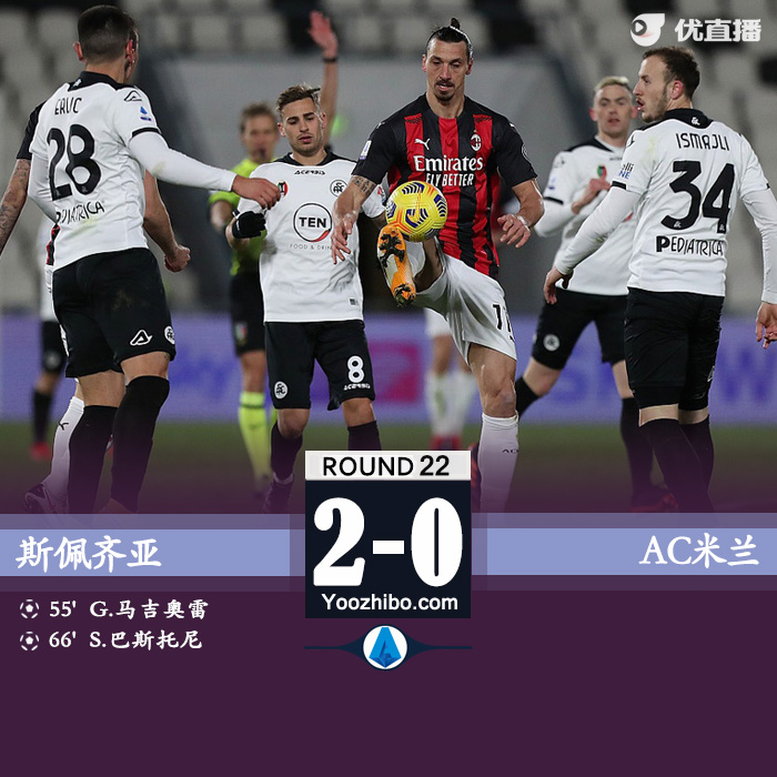 优直播2月14日讯 北京时间2月14日03:45,意甲第22轮斯佩齐亚主场迎战AC米兰。上半场比赛,AC米兰无明显机会0射正。下半场,马吉奥雷首开记录,巴斯托尼世界波破门,AC米兰全场零射正。最终,AC米兰客场0-2不敌斯佩齐亚,球队2连胜终结,暂时仍以2分优势领跑积分榜。