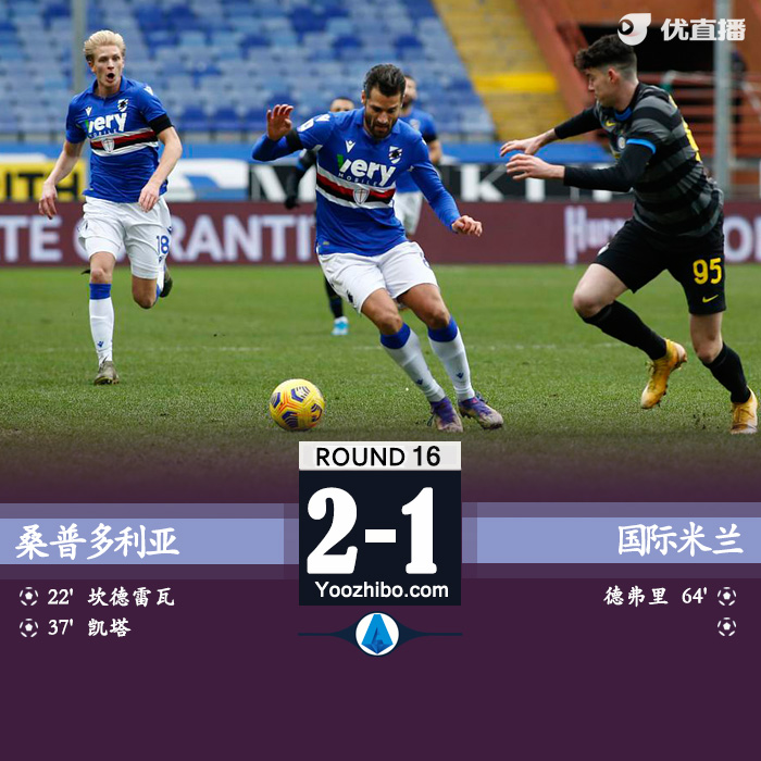 优直播1月6日讯 北京时间1月6日22:00,意甲联赛第16轮一场比赛在桑普多利亚和国际米兰之间进行。上半场桑切斯点球被扑阿什利扬补射中柱,托内利头球中框坎德雷瓦点球破僵,达姆斯高精彩突破助攻凯塔破门。下半场德弗里扳回一球。最终国米客场1-2不敌桑普联赛八连胜遭终结,在积分榜继续落后AC米兰1分排名次席。