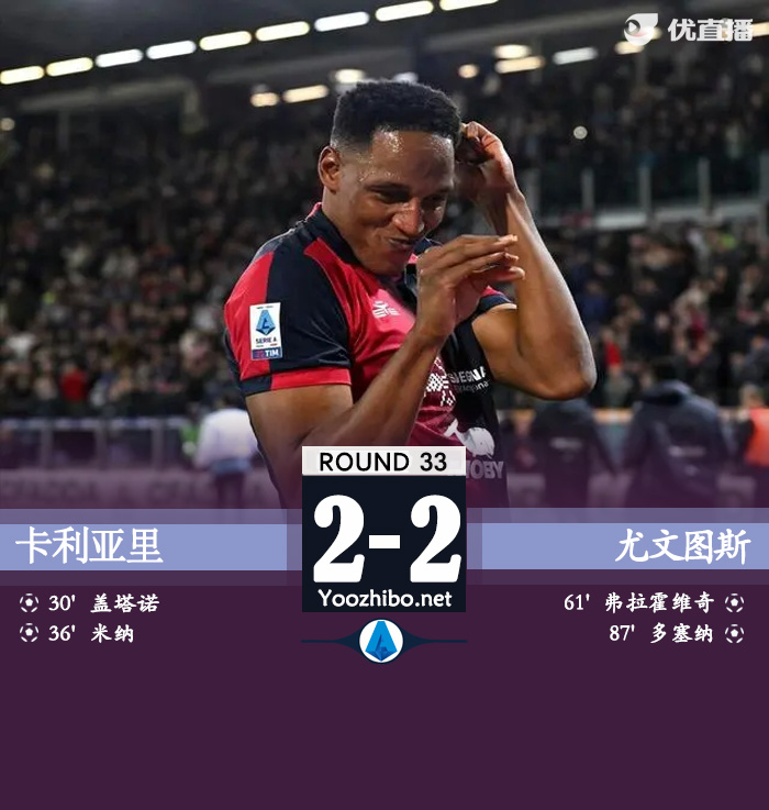 优直播讯:北京时间4月20日,意大利足球顶级联赛第33轮,卡利亚里队主场迎战尤文图斯队。上半场,布雷默、什琴斯尼连续送点,加埃塔诺、米纳点射破门,基耶萨越位在先,弗拉霍维奇进球被吹。下半场,弗拉霍维奇任意球破门,伊尔迪兹传中造成多塞纳自摆乌龙,最终,尤文客场2-2卡利亚里。