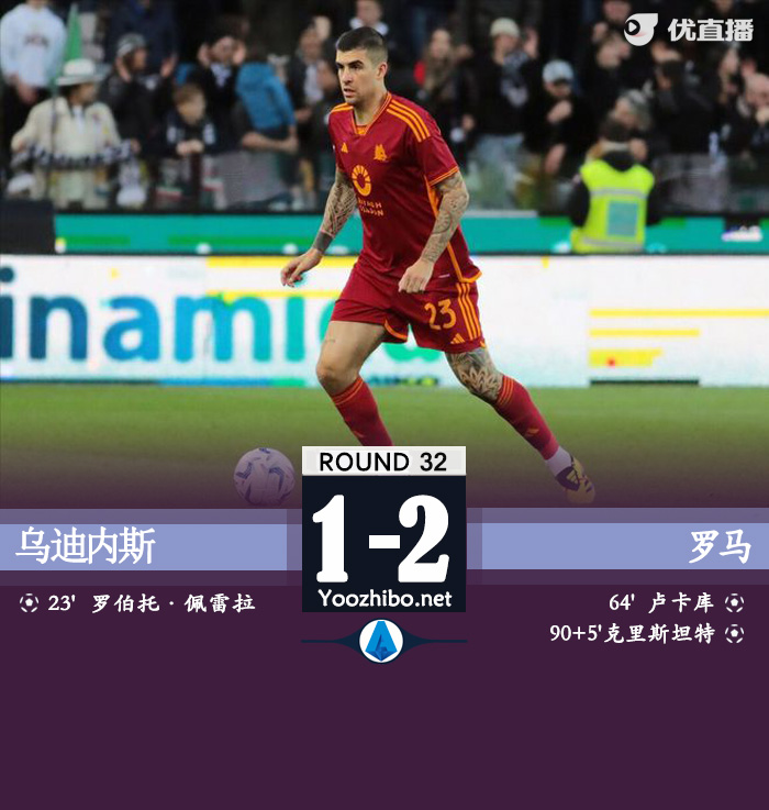 优直播讯:北京时间4月15日00:00,罗马客场挑战乌迪内斯。上半场,怀森后场逆天失误,罗伯特-佩雷拉单刀破门。下半场,卢卡库头球暴扣扳平!恩迪卡第72分钟心脏不适,比赛中断。北京时间4月26日2:00,比赛从第72分钟坠球恢复;第95分钟,克里斯坦特头球绝杀!最终,罗马2-1击败乌迪内斯。