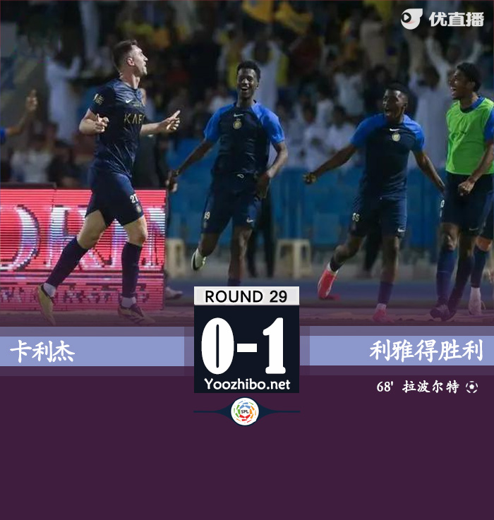 优直播讯:北京时间4月28日2:00,沙特联第29轮,利雅得胜利客场对阵卡利杰。上半场,C罗击中横梁,随后进球越位被吹。下半场,拉波尔特任意球机会头球破门!最终,利雅得胜利1-0击败卡利杰,取得联赛6连胜!先赛距离排名榜首的利雅得新月9分,仍居第2。