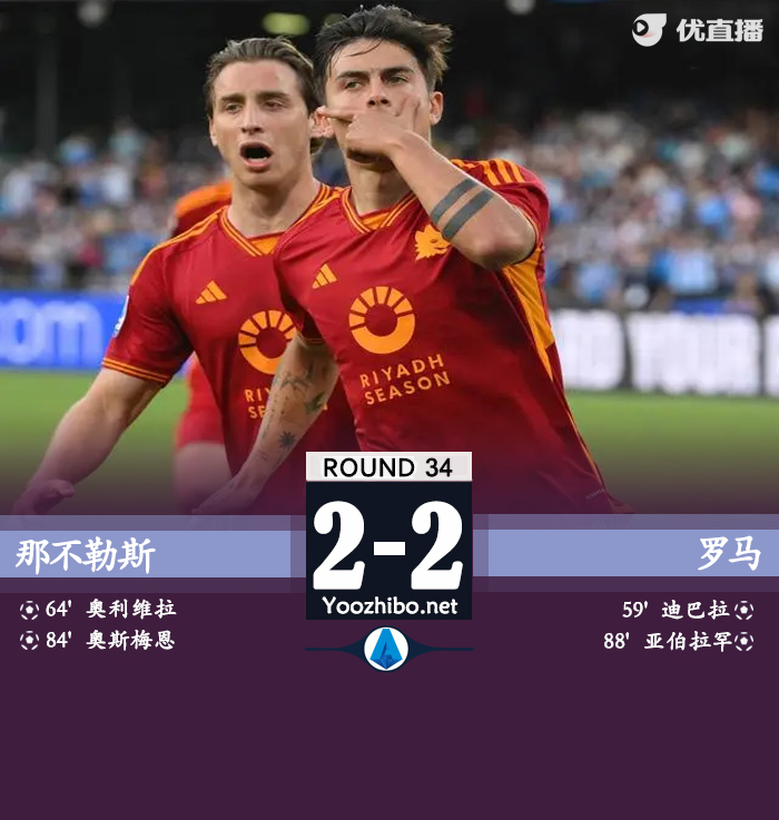 优直播讯:北京时间4月29日,意甲联赛第34轮,罗马客场迎战那不勒斯。上半场双方均无建树。下半场,阿兹蒙造点,迪巴拉点射帮助罗马领先;奥利维拉变线破门扳平;桑谢斯送点,奥斯梅恩点射反超!亚伯拉罕破门被吹越位,但VAR确认进球有效。最终罗马2-2战平那不勒斯,仍然排名第5位列欧冠区,多赛1场领先身后的亚特兰大2分。