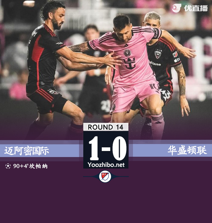 优直播讯:北京时间5月19日07:30,美职联迈阿密国际迎战华盛顿联的比赛,上半场双方攻势寥寥,克雷马斯基失单刀,半场结束,迈阿密国际0-0华盛顿联。下半场布斯克茨助攻坎帕纳补时抽射绝杀,最终迈阿密国际1-0华盛顿联。
