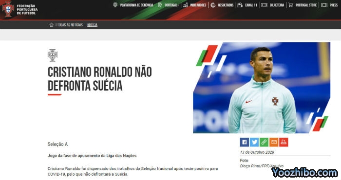 10月13日优直播讯,葡萄牙足协官方消息,葡萄牙巨星C罗新冠检测结果为阳性。
