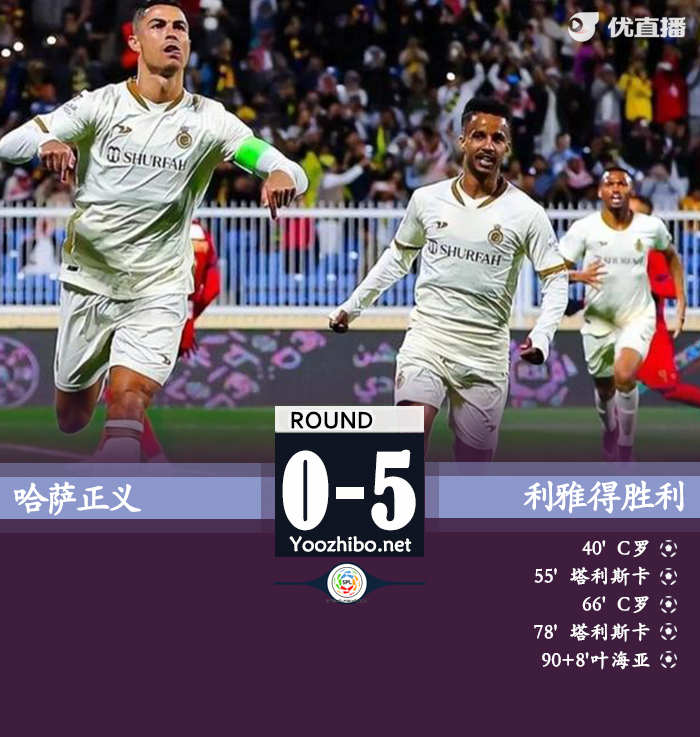 优直播讯 北京时间4月5日03:00,沙特联赛第22轮利雅得胜利挑战哈萨正义的比赛,上半场阿姆里造点,C罗点射破门,下半场塔利斯卡、C罗均完成双响,叶海亚补射建功,最终利雅得胜利客场5-0大胜哈萨正义。