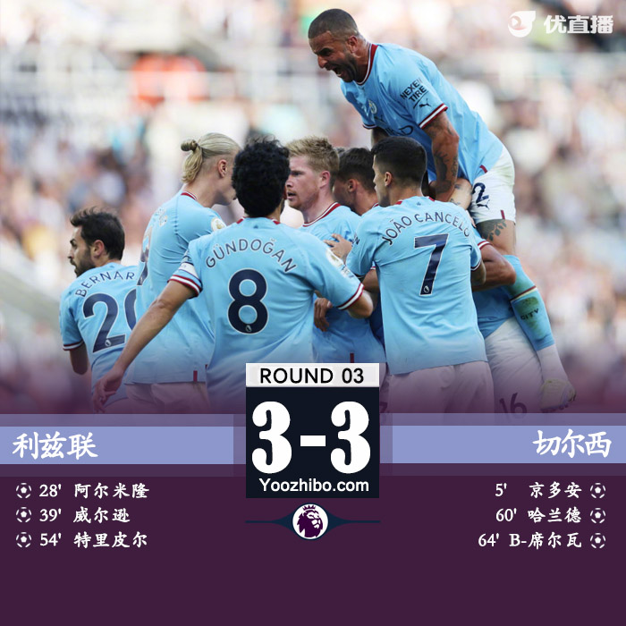 优直播讯北京时间8月21日23点30分,英超第3轮曼城客场挑战纽卡斯尔。上半场,京多安闪击破门,曼城攻势占优,波普多次贡献扑救,阿克伤退,圣马连续助攻阿尔米隆和威尔逊完成反超。下半场,哈兰德中柱,特里皮尔任意球破门,哈兰德和B席先后进球将比分扳平,全场比赛结束,曼城3-3纽卡斯尔。
