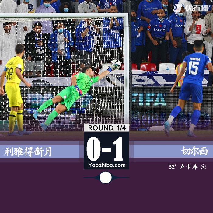 优直播2月10日讯 北京时间2月10日0:30,世俱杯半决赛,利雅得新月对阵切尔西。上半场,齐耶赫远射造险,卢卡库门前错失良机,随后门前捡漏破门。下半场,哈弗茨小角度挑射击中立柱,凯帕连续扑救挡出马雷加、坎诺射门。全场比赛结束,切尔西1-0击败利雅得新月,晋级决赛,将对阵帕尔梅拉斯。