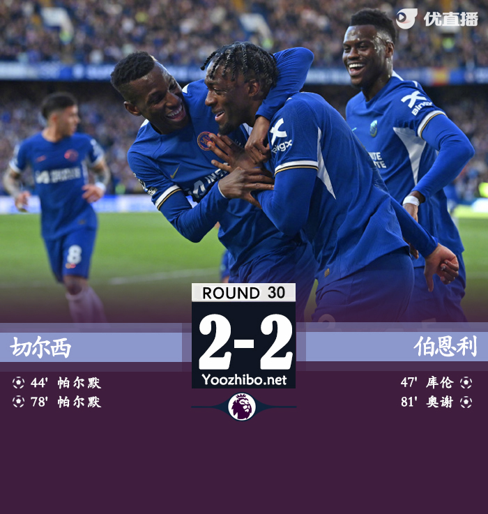 优直播讯 北京时间3月30日23:00,2023-24赛季英超联赛第30轮,切尔西坐镇斯坦福桥球场迎战伯恩利。上半场迪萨西进球被吹,穆德里克造点,阿西尼翁两黄变一红被罚下,帕尔默勺子点球命中,切尔西暂1-0伯恩利;下半场库伦为伯恩利扳平比分,斯特林助攻帕尔默再下一城,伯恩利由达拉-奥谢再度扳平,古斯托伤退,最终切尔西2-2伯恩利,无缘连胜。