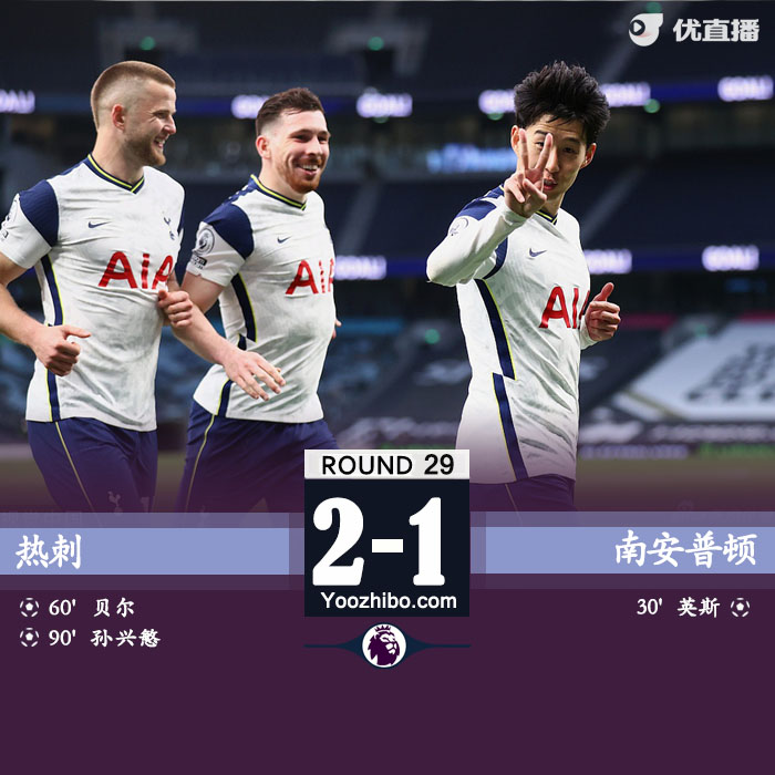 优直播4月22日讯 北京时间4月22日凌晨1时,2020-2021赛季英超联赛第29轮的一场补赛展开角逐,热刺坐镇主场迎战南安普顿。上半场,丹尼-英斯头球破门,南安普顿半场1-0领先热刺。下半场,贝尔扳平比分,随后孙兴慜点球破门完成绝杀。最终热刺主场2-1击败南安普顿。
