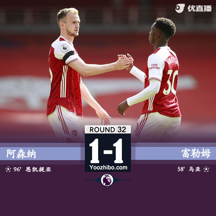 优直播讯 北京时间4月18日晚上20:30,2020-21赛季英超第32轮,阿森纳主场迎战富勒姆。上半场,马丁内利屡失良机,塞巴略斯进球越位。半场战罢,阿森纳暂0-0富勒姆。下半场,加布里埃尔送点,马雅点射命中,拉卡泽特伤退,恩凯提亚读秒绝平。全场结束,阿森纳1-1富勒姆,距离欧冠区9分。