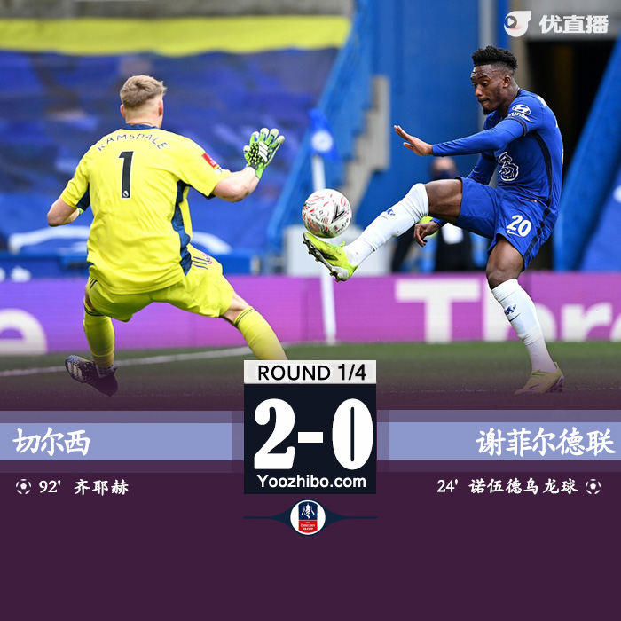 优直播3月21日讯 北京时间今天21:30,足总杯1/4决赛切尔西在斯坦福桥球场迎战谢菲联的比赛准时开始。上半场奇尔维尔远射造成诺伍德乌龙,半场切尔西暂时一球领先。下半场终场前齐耶赫破门,全场结束切尔西2-0击败谢菲联晋级。