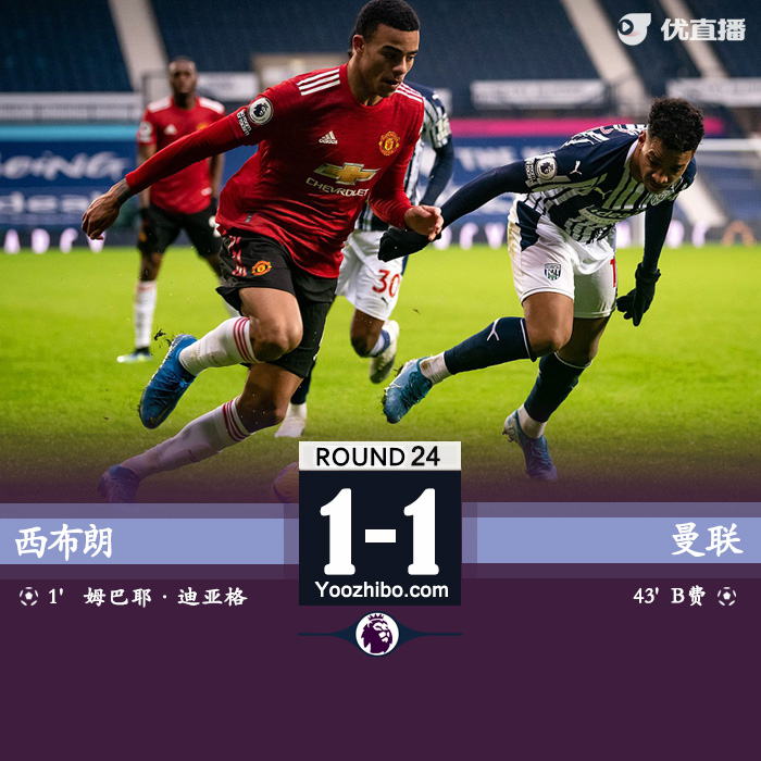 优直播2月14日讯 北京时间2月14日22点,英超第24轮曼联客场挑战西布朗。上半场,迪亚涅闪击破门,B费在上半场尾声时扳平比分.下半场,西布朗完成门线解围,马奎尔出现失误,德赫亚也扑出迪亚涅的单刀,马奎尔补时阶段头球中柱。全场比赛结束,曼联1-1西布朗。本场比赛过后,曼联积46分以净胜球优势反超莱斯特城排在积分榜第二。