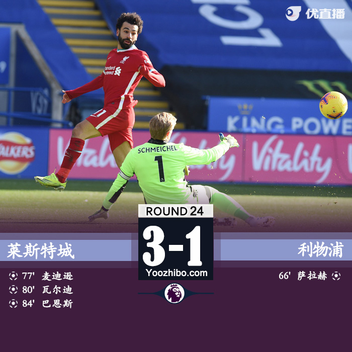 优直播2月13日讯北京时间2月13日20点30分,英超第24轮莱斯特城主场迎来强敌利物浦。上半场,米尔纳伤退,利物浦呈现围攻之势但未能破门,小舒梅切尔多次做出成功扑救,瓦尔迪反击射中横梁。下半场,阿诺德任意球攻门击中横梁,萨拉赫兜射破门,麦迪逊任意球扳平比分,利物浦后防失误送礼,瓦尔迪打进反超球,巴恩斯锁定胜局,全场比赛结束,莱斯特城3-1利物浦。本场比赛过后,莱斯特城在多赛2场的情况下拿到46分升到积分榜第二,落后榜首的曼城4分。利物浦遭遇三连败后则是以40分继续排在第四,在先赛一场的情况下仅领先身后的切尔西和西汉姆1分。
