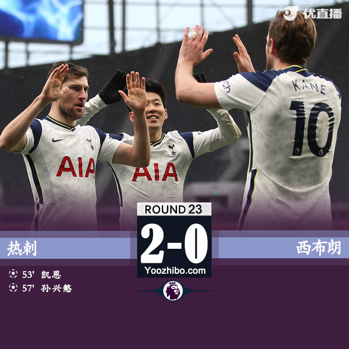 优直播2月7日讯 北京时间2月7日晚20:00,英超联赛第23轮继续进行,热刺坐镇主场迎战西布朗。上半场,凯恩劲射中框后又失单刀良机,洛里扑出近距离头球攻门,双方均未改写比分。下半场,凯恩破门打破僵局,孙兴慜扩大比分,迪亚涅打入两球都越位在先。全场比赛结束,热刺2-0力克西布朗,结束三连败。