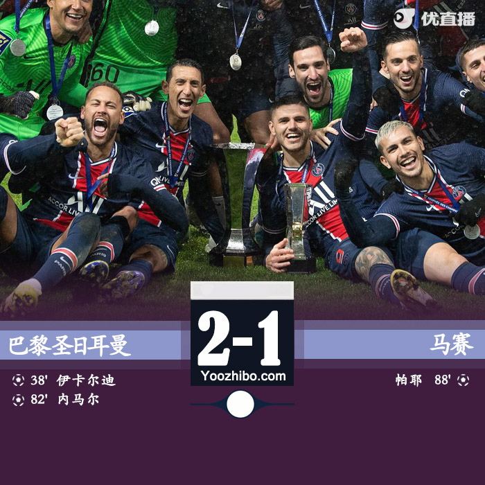 优直播1月14日讯 北京时间1月14日4:00,法国超级杯决赛打响,巴黎圣日尔曼迎战马赛。上半场,伊卡尔迪、姆巴佩接连越位进球被吹,伊卡尔迪打破僵局后又击中横梁。下半场,内马尔复出登场点球建功,帕耶扳回一球。全场比赛结束,巴黎2-1战胜马赛,连续八年夺得法国超级杯。