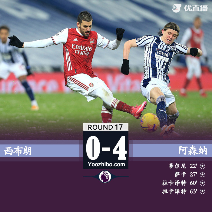 优直播1月3日讯 北京时间1月3日04:00,英超第17轮继续进行,阿森纳客场挑战西布朗。上半场,蒂尔尼右脚兜射先下一城,史密斯-罗助攻萨卡推射空门扩大比分,下半场,拉卡泽特四分钟内完成双响。最终,阿森纳客场4-0大胜西布朗,取得三连胜升至第11位。