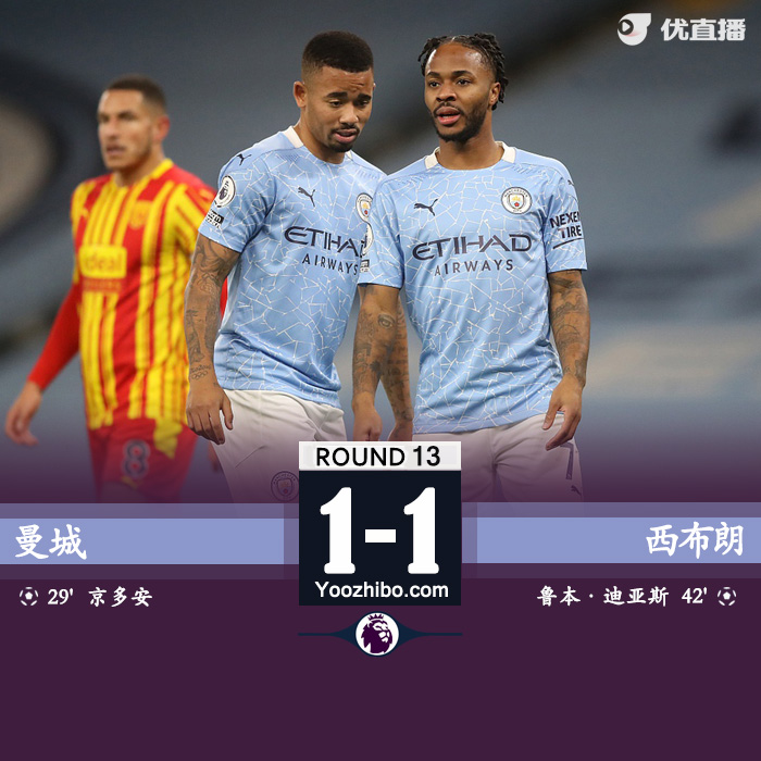 优直播讯:北京时间12月16日4:00,英超第13轮,曼城迎战西布朗。上半时斯特林助京多安为曼城先拔头筹,尾声阶段阿雅伊造成鲁本-迪亚斯乌龙。下半时双方均无建树。最终,曼城1-1西布朗。