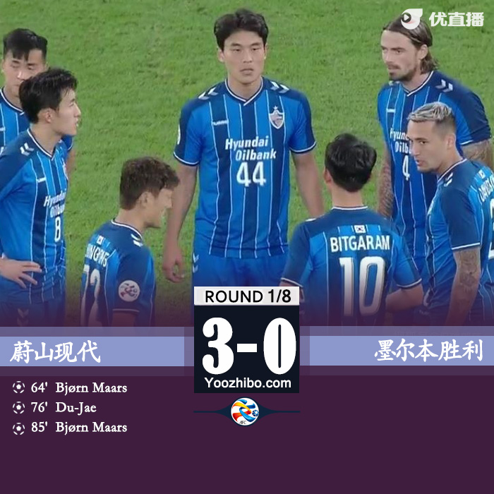 优直播讯:北京时间12月6日22:00,亚冠1/8决赛,蔚山现代对阵墨尔本胜利。上半场,金仁成错失单刀,墨尔本胜利门将克罗康比屡献神扑;下半场,替补登场的约翰森双响,尹比加兰助攻元斗载破门。最终,蔚山现代3-0击败墨尔本胜利,晋级本赛季亚冠八强。