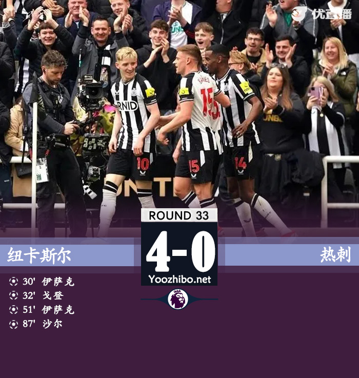 优直播讯:北京时间4月13日在英超联赛第33轮的比赛中,纽卡斯尔联队在主场迎战托特纳姆热刺队。伊萨克在比赛中攻入两球,安东尼-戈登和法比安-舍尔也各自有进球。最终比分是纽卡斯尔联 4-0 托特纳姆热刺。