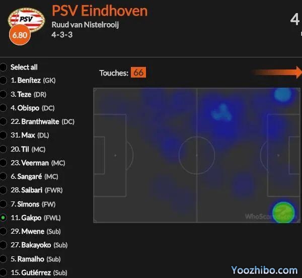 有报道称,加克波的进球效率归功于新帅范尼将他放在中锋位置,这是错误的说法。实际上,身披埃因霍温11号战袍的加克波仍然更多担任左边锋,该队中锋为7号哈维·西蒙斯或者9号卢克·德容。下图是埃因霍温最近一战4-3力克费耶诺德一战中,加克波的活动热图,明显都在左侧。