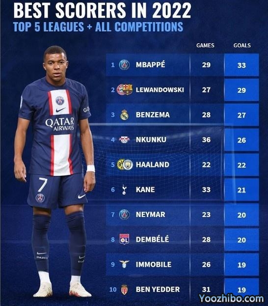 优直播讯 北京时间09月13日 ,德国转会市场盘点了五大联赛球员2022年射手榜,姆巴佩33球居首,莱万27球位列第二,本泽马排名第三。