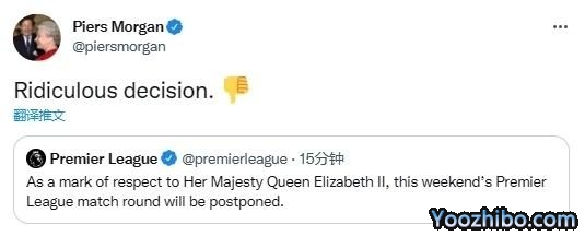 摩根此前表示不应该因为女王去世而推迟体育赛事,因为女王热爱体育运动,而且还能看到/听到人们聚在一起唱国歌向女王陛下致敬。而且政府也没有强制本周末所有比赛取消,但英超联盟还是决定出于对女王陛下的尊敬。本周末的英超比赛将被推迟,包括周一晚上的比赛。