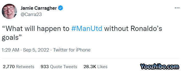 优直播09月05日讯 今天凌晨,曼联在英超联赛中3-1击败阿森纳,赛后利物浦名宿卡拉格在推特发文调侃了C罗和他的球迷。