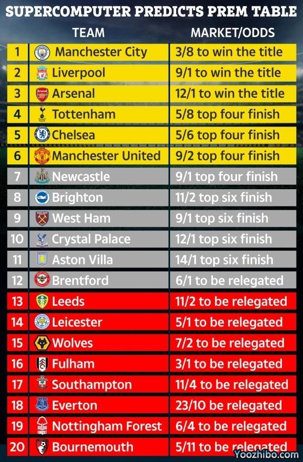 优直播08月24日讯 据《太阳报》报道,超级计算机预测本赛季英超冠军将由曼城获得,利物浦、阿森纳和热刺则分别排名2-4位。
