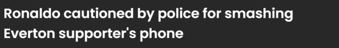 优直播08月18日讯 默西塞德郡警方证实,C罗砸球迷手机一事已经处理完毕,球员早到警方的附带条件警告。