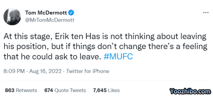 据记者汤姆·麦克德莫特(Tom McDermott)披露,眼下滕哈格还没有考虑离开曼联主帅的位置,但如果情况不发生根本性改变,那么人们感觉他会主动寻求离开,而不是深陷泥潭。