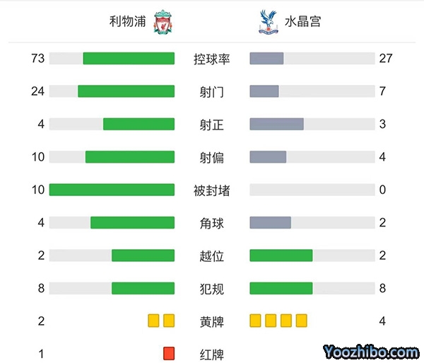 利物浦1-1水晶宫 迪亚斯世界波努涅斯染红