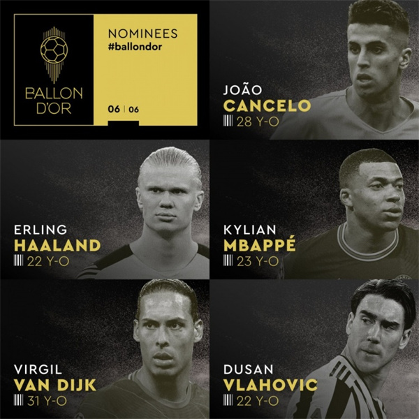 第六批:弗拉霍维奇(尤文)、范迪克(利物浦)、坎塞洛(曼城)、姆巴佩(巴黎)、哈兰德(曼城)