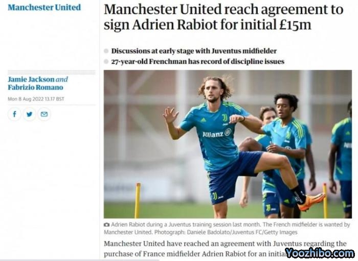 优直播08月09日讯 罗马诺和天空体育消息,曼联和尤文图斯就拉比奥转会达成一致,但还要和他的母亲达成一致。