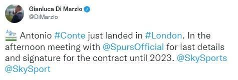 优直播11月02日讯 今日,迪马济奥称,孔蒂已经飞抵伦敦,即将与热刺签约一年半直至2023年6月。