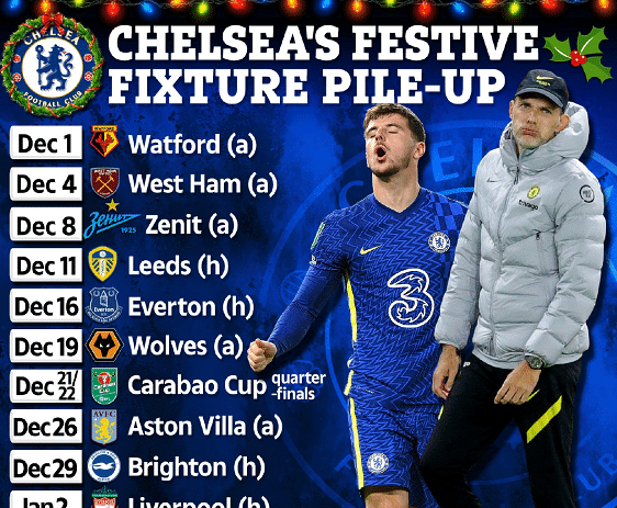 12月2日,切尔西要客场对阵沃特福德,跟着12月4日他们就要客场对阵西汉姆,跟着12月9日,他们就要远征俄罗斯对阵泽尼特,随后12月11日他们要回到主场对阵利兹联,跟着12月17日他们要主场对阵埃弗顿,12月19日要客场对阵狼队,随后12月27日要客场挑战维拉,跟着12月30日要主场对阵布莱顿,最后1月3日主场对阵利物浦,结束这段魔鬼赛程。当然,对切尔西来说,10场比赛只是基本的数字,如果他们联赛杯继续晋级,他们可能还要多踢一场联赛杯的比赛,这对切尔西球员的体力将会是一大考验。
