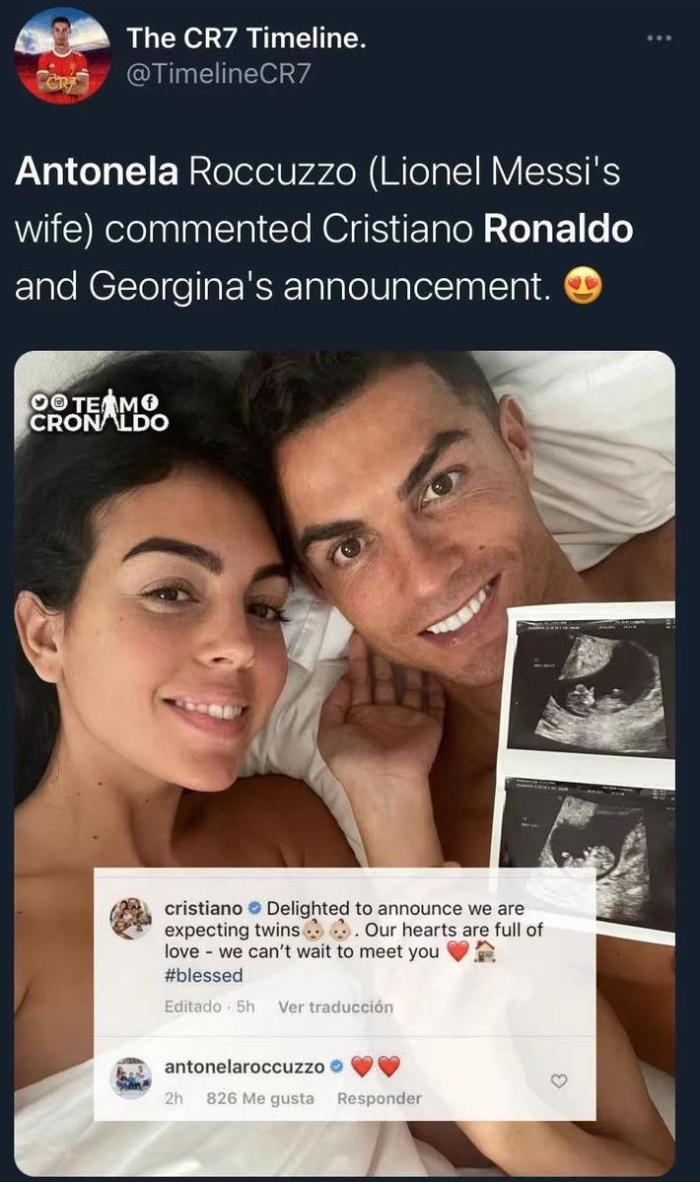 优直播10月30日讯 ,C罗在个人社交媒体宣布乔治娜怀上双胞胎,随后梅西的妻子安东内拉送上祝福。