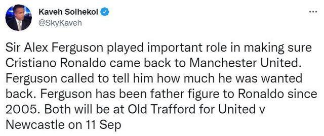 优直播8月28日讯 据天空体育记者Kaveh Solhekol报道,弗格森在C罗回归曼联这笔交易中起了很大作用。