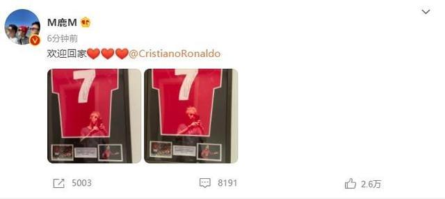 鹿晗晒出了两张曼联7号球衣的照片:欢迎回家,C罗!鹿晗是著名曼联球迷,也是红魔大使。