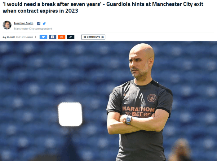 优直播讯 据进球网报道,瓜迪奥拉表示自己想在2023年与曼城的合约到期后休息一下,他称自己接下来可能会执教国家队。