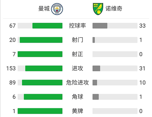 最终全场比赛结束,最终曼城5-0完胜诺维奇。