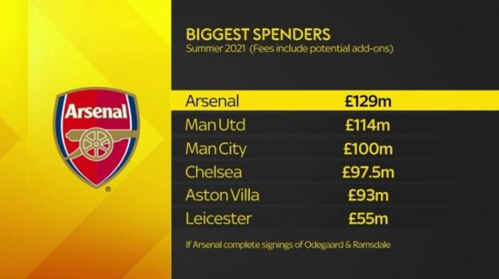 优直播讯 由于阿森纳即将签下厄德高和拉姆斯代尔,因此,有媒体统计,如果加上这两笔交易的转会费,阿森纳今夏的转会支出将达到1.29亿英镑,位列英超球队第一。
