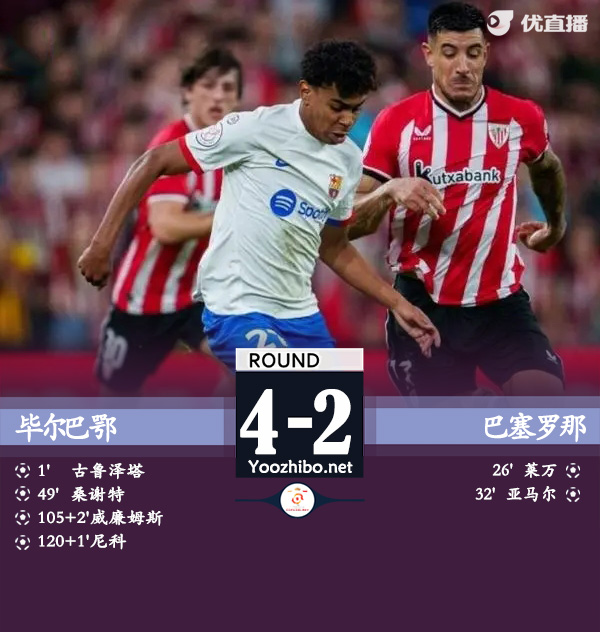 优直播讯 1月25日讯 国王杯1/4决赛,巴萨对阵毕尔巴鄂。上半场开场仅38秒,巴萨后防解围失误,古鲁泽塔闪击破门,莱万同样也是利用毕巴解围失误扳平比分,亚马尔一条龙内切远射反超比分。易边再战桑塞特头槌破门扳平,亚马尔两次错失单刀。常规时间巴萨2-2毕巴进入加时赛。加时赛上半场补时,伊纳基关键破门,下半场补时,尼科锁定胜局。最终巴萨加时鏖战2-4不敌毕巴止步八强。
