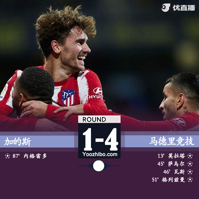 优直播讯 北京时间2022年8月5日03:00,2022/2023赛季热身赛进行了一场较量,加的斯坐镇主场迎战马德里竞技。上半场,马德里竞技率先打破僵局,凭借莫拉塔和萨乌尔的进球,2:0领先。下半场,马德里竞技率先发难,沃斯和格列兹曼取得进球扩大优势;随后,内格雷多也取得进球加的斯缩小差距。最终,马德里竞技4:1获胜。
