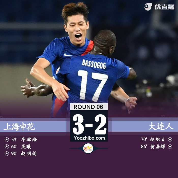 优直播7月19日讯 北京时间7月19日18:30,中超第6轮,上海申花对阵大连人。上半场,两队整体节奏较慢,陶强龙开场远射造险,曹赟定伤退;下半场,巴索戈助攻毕津浩头球破门,吴曦助申花2球领先,赵旭日扳回一城,黄嘉辉第87分钟扳平比分,赵明剑绝杀。最终,申花3-2击败大连人,收获近4轮首胜。