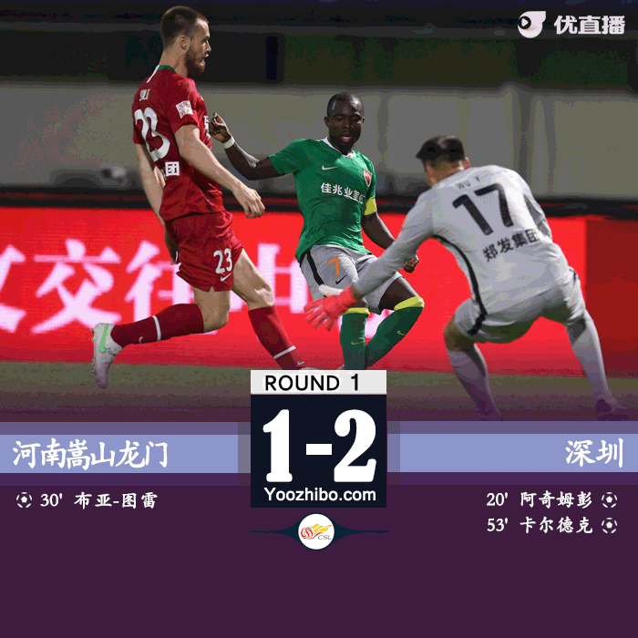 优直播4月21日讯 北京时间4月21晚8点,2021赛季中超联赛广州赛区首轮比赛继续展开角逐,深圳队与河南嵩山龙门在花都体育场直接交锋。上半场,金特罗助攻阿奇姆彭率先建功,随后,张鹭出击失误被图雷打空门得手。下半场,卡尔德克利用角球头槌为深圳再次超出比分。最终,深圳队2-1战胜河南嵩山龙门,取得联赛开门红。