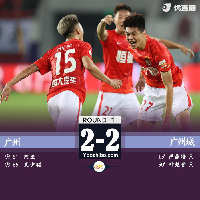 优直播4月20日讯 北京时间4月20日20:00,新赛季中超首轮一场焦点战在广州队和广州城之间进行。上半场阿兰打入新赛季首球,黄政宇制造严鼎皓乌龙,韩佳奇扑出艾克森点球。下半场吉列尔梅助攻叶楚贵反超,吴少聪替补扳平比分。最终广州队2-2战平广州城。
