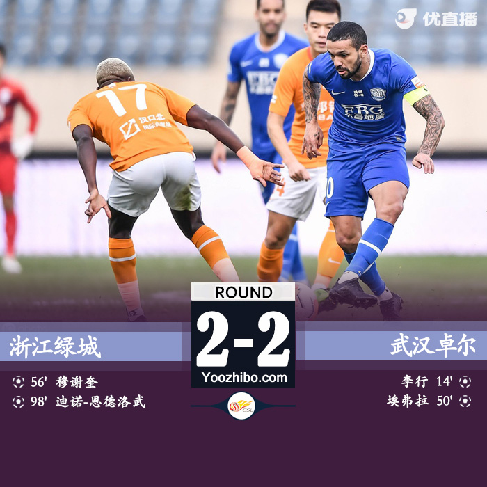 优直播讯:北京时间11月18日晚19时35分,中超升降级附加赛首回合,浙江绿城与武汉卓尔展开较量。上半场巴普蒂斯唐助攻李行首开纪录,迪诺头球造险埃弗拉补时破门扩大比分。下半场穆谢奎破门扳回一球,比赛最后时刻绿城获得点球机会,迪诺命中绝平,最终双方2-2战平。