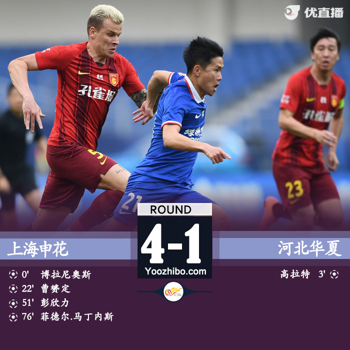 优直播讯:11月6日,中超联赛7-8名排位赛,上海申花对阵河北华夏幸福,博拉尼奥斯推射破门打破僵局,高拉特迅速扳平;随后曹赟定射门造成对方乌龙球,下半场彭欣力打进世界波,随后于汉超造点马丁斯命中,申花4-1华夏幸福。
